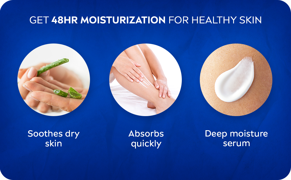 Intense Hydration: Boasts Nivea Deep Moisture Serum and aloe vera extracts to provide 48 hours of deep hydration, leaving your skin feeling soft and smooth. Lightweight & Non-Greasy:Absorbs quickly into the skin without leaving a greasy residue, making it comfortable for everyday use, even in hot weather. Suitable for All Skin Types: Formulated to be gentle enough for even sensitive skin, without harsh chemicals or fragrances. Refreshing Feeling: Aloe vera provides a naturally cooling and soothing sensation, perfect for hot days or after activities.